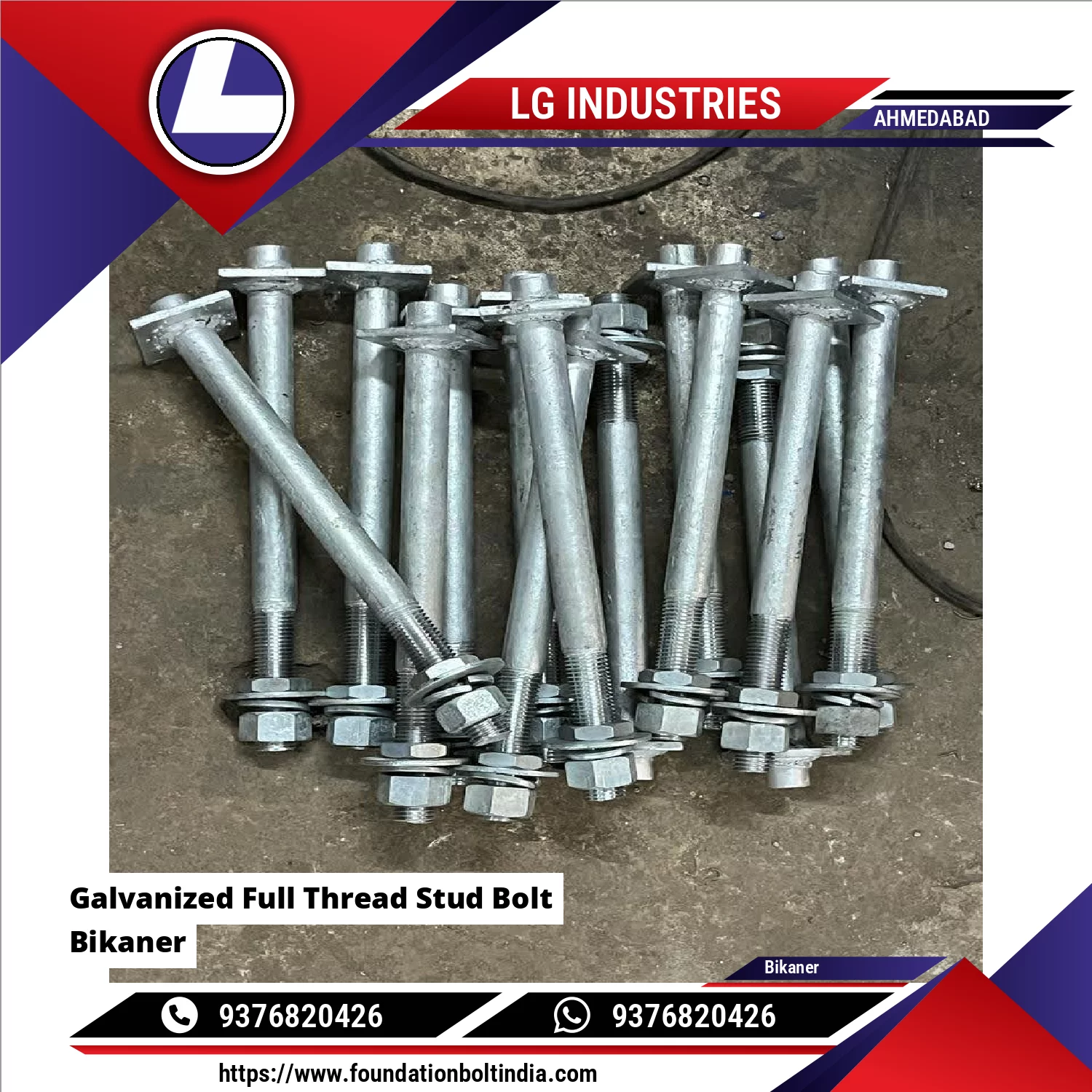 LG Industries manufactures Galvanized Full Thread Stud Bolt is a high-strength fastening element designed for secure clamping and anchoring applications in structural, mechanical, and industrial projects. It features continuous threading along its entire length, allowing flexible adjustment and uniform load distribution when used with nuts on both ends.