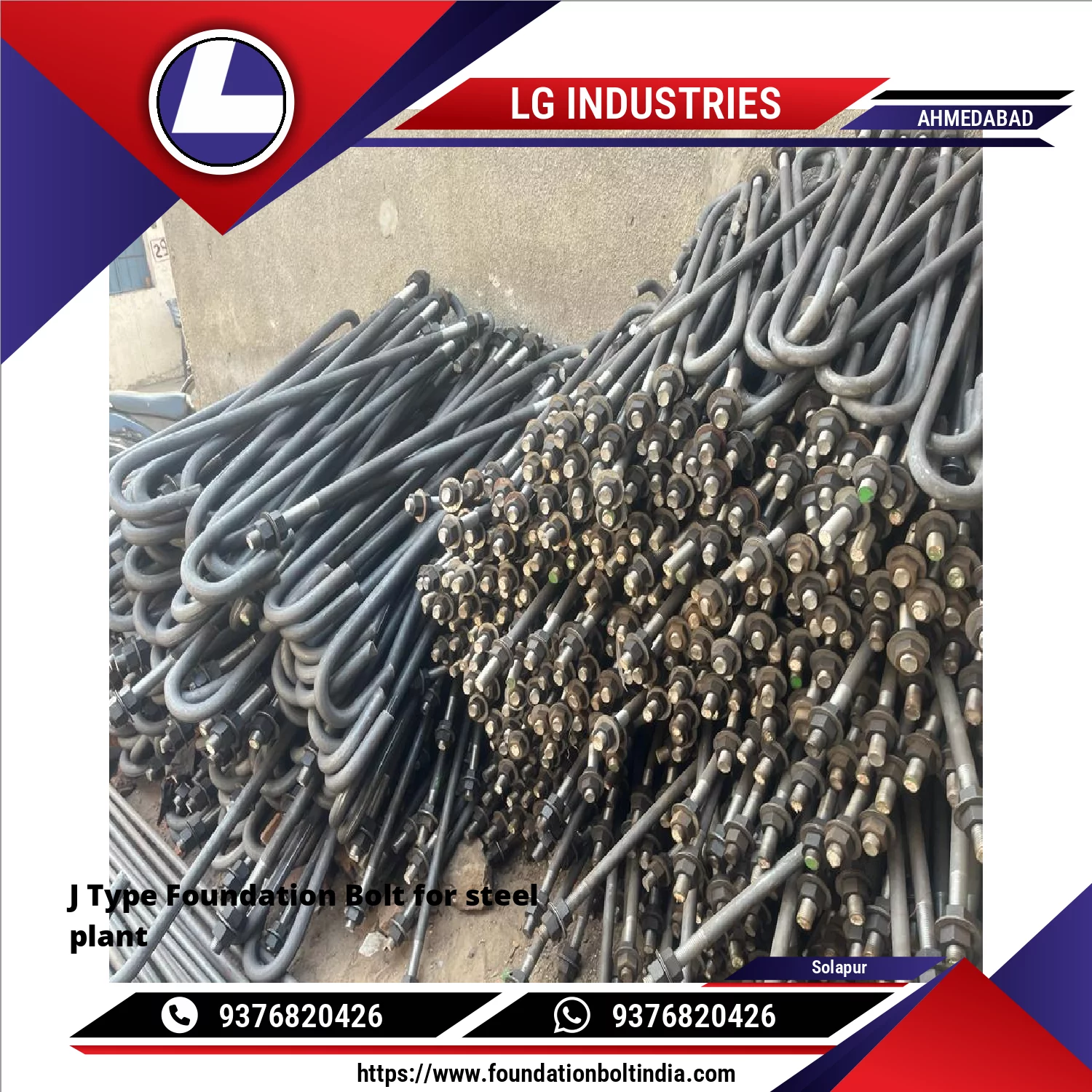 LG Industries manufactures J Type Foundation Bolt is a curved, J-shaped anchor bolt used for securing heavy industrial equipment, steel structures, machinery foundations, and structural columns. Its hook-shaped end provides strong anchorage within concrete, making it ideal for environments requiring high load-bearing capacity and vibration resistance—such as steel plants.